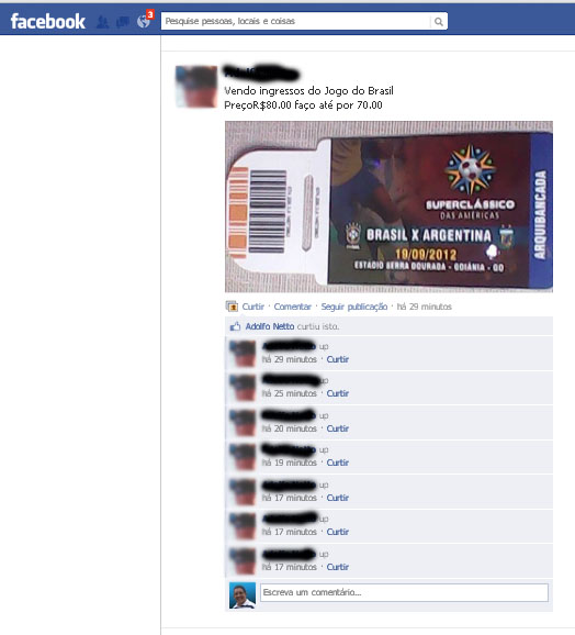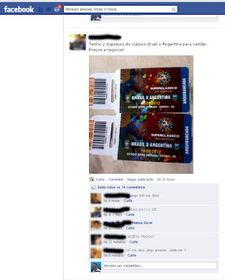 Para o jogo Brasil X Argentina, quarta-feira, no Serra Dourada, foi lançada uma nova modalidade: Os cambistas das redes sociais.